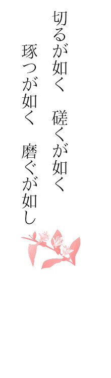 「切磋」とは、玉や石を切り、形を整えていくこと。「琢磨」とは、形を作り、それを磨き上げることで、「切磋琢磨」とは、学問に励み、互いに励まし合い、努力を重ねることを意味します。目標に向かう志と努力、そして、よき友や環境の存在が、その人の持つ能力を最大限に発揮させるのです。