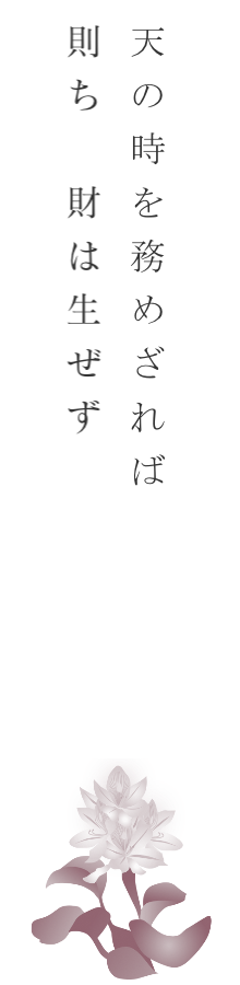 中国春秋時代の斉の宰相、管仲の著書『管子』に見られる言葉です。農作業の時期を誤れば、収穫が十分でないことに喩えて、物事には、それを行うのに最も適した時機があると教えます。