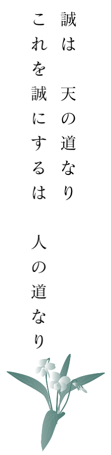 「誠は 天の道なり」とは、天地自然の道理、即ち、日月の運行や四季の移り変わりなどが寸分のズレもないという自然の誠実さを意味します。